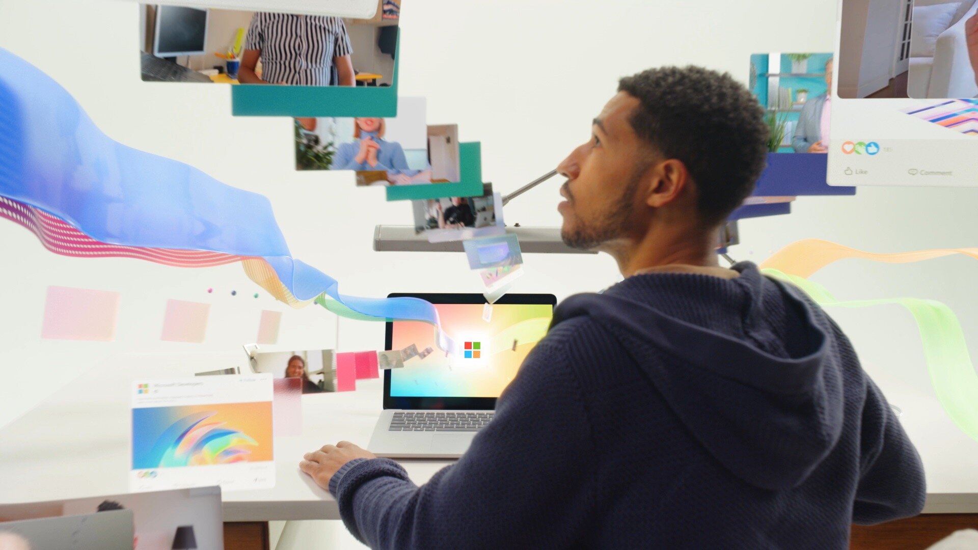 Our work centred on building an abstract Microsoft universe, a space where people interact with floating panels, data streams and interface elements that expand and surround them. From screens that burst to life to a seamless dive into the computer’s world, we designed each moment to feel futuristic, fluid and full of motion.