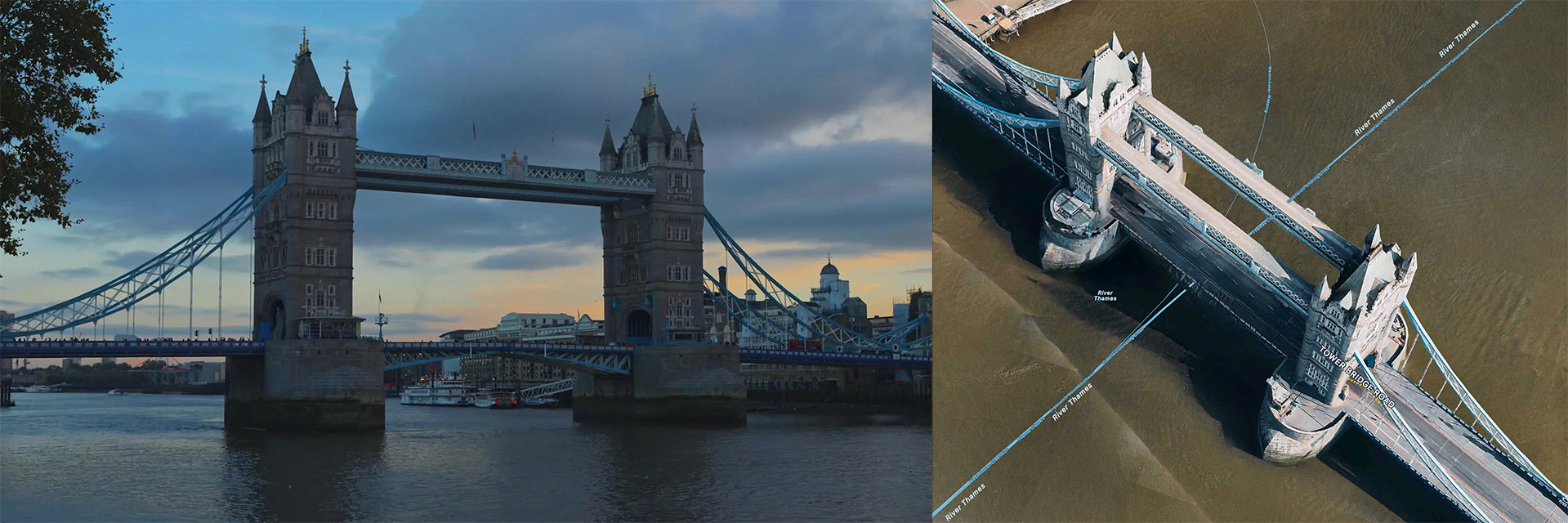 We began with stock or purchased location footage and high-res stills — from London’s Tower Bridge to Sydney Harbour. These were our “blank stages.”