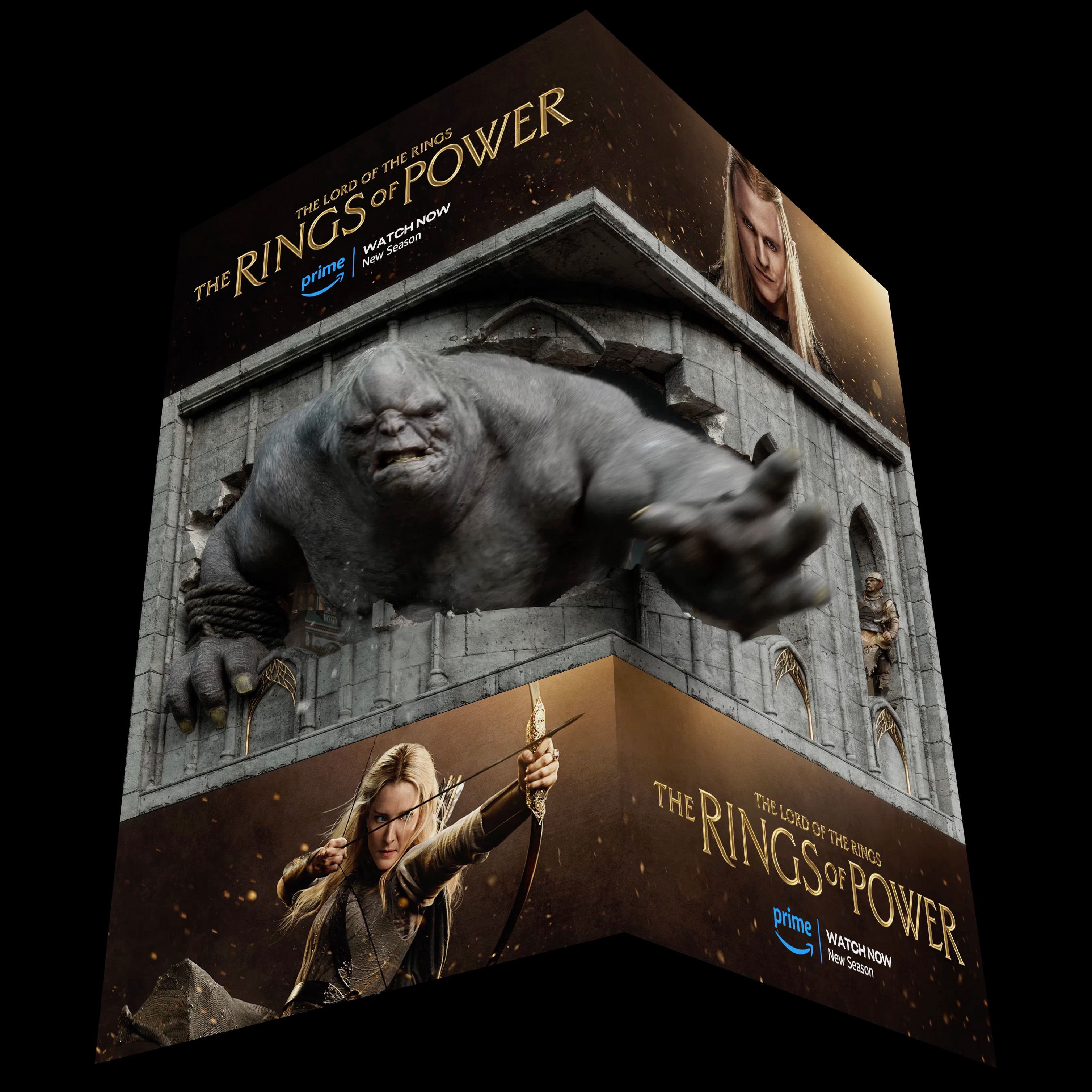 Godzilla’s width gave us a very different challenge — and opportunity. We positioned the 3D moment on the right corner of the board, which gave the illusion real depth when viewed from the optimal street angle. The remaining width allowed us to run a short sizzle clip from the show on one side — timed so flaming boulders in the footage synced perfectly with our CG wall collapse — and additional static key art on the return side. For this version, we also incorporated custom Prime Video and Rings of Power logos, styled with gold leaf detailing to match the design language of the show itself.