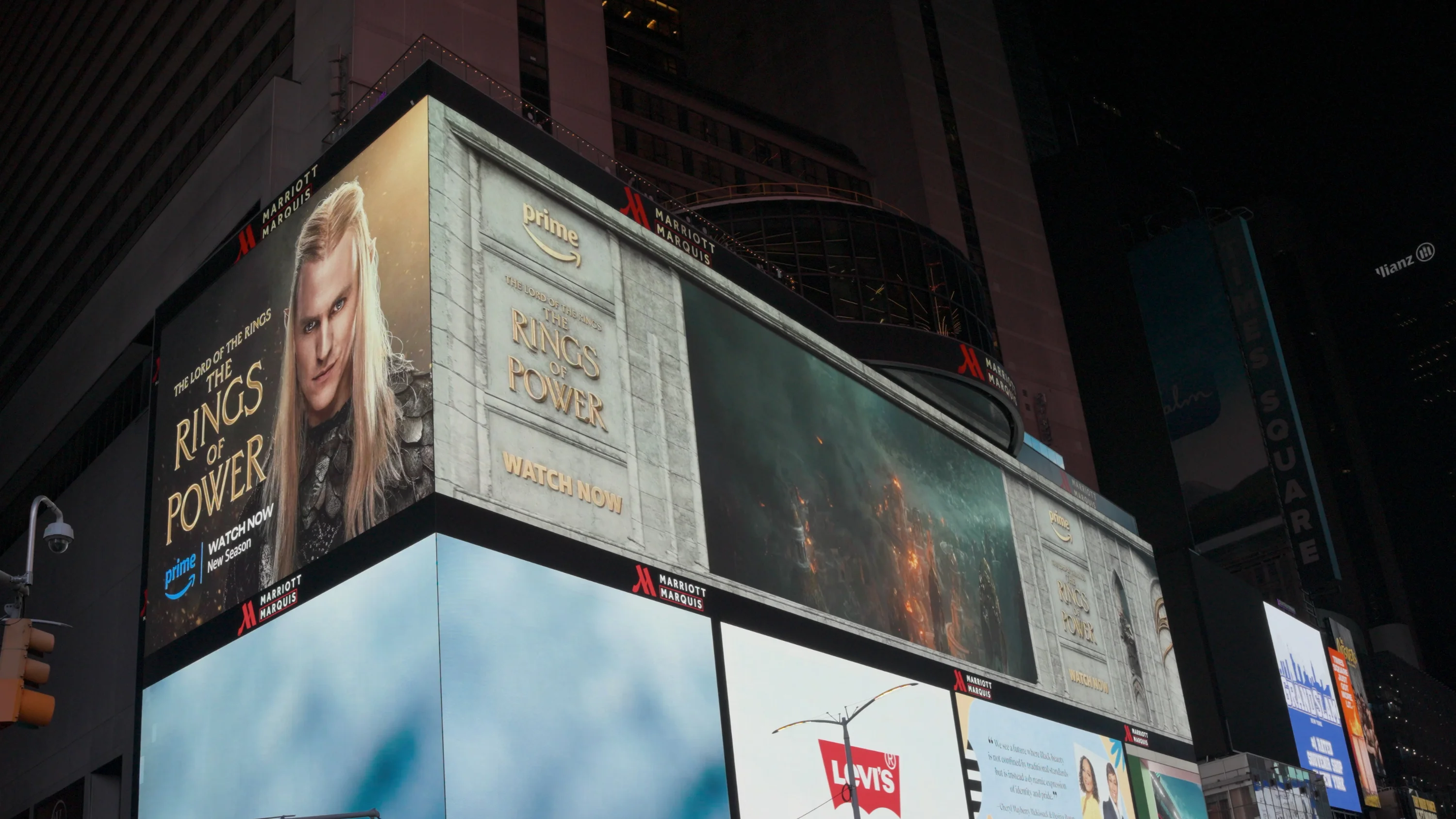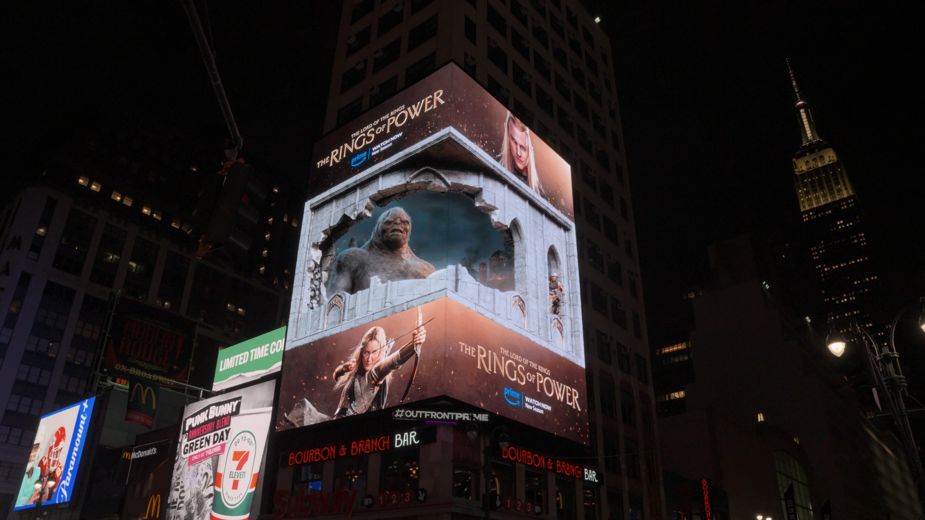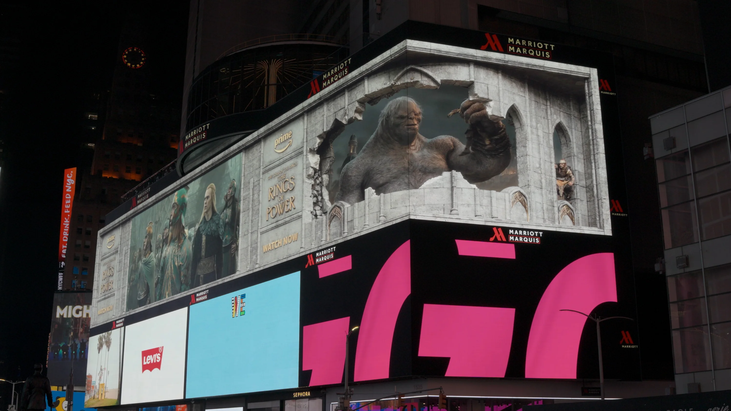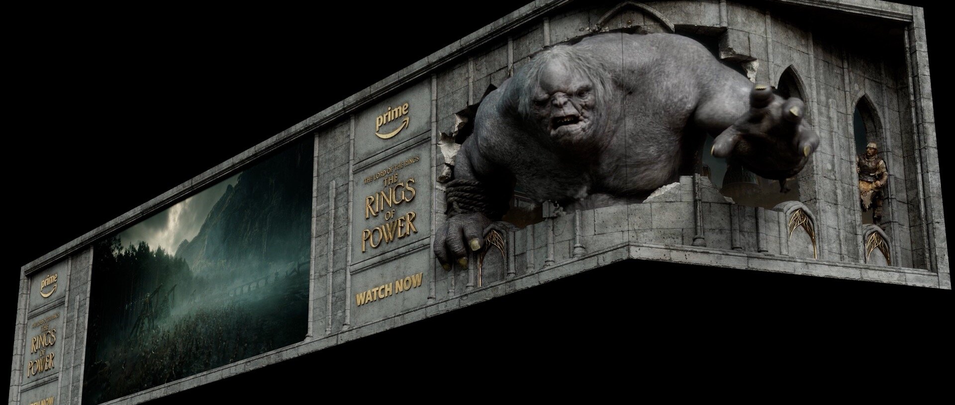 Working with Amazon, we created the 3D billboard campaign for The Lord of the Rings: The Rings of Power, bringing the dark forces of Middle-earth to life above some of the world’s busiest city streets. Our team produced the full CG animation, featuring Orcs and a Troll bursting through a crumbling stone wall, designed specifically for the huge dual-screen “Godzilla” and Penn boards in New York City.